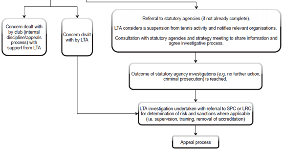 - The LTA Safeguarding Team is responsible for assessing all safeguarding concern/disclosures that are reported to them and working with the club Welfare Officer and National Safeguarding Leads to follow up as appropriate on a case-by-case basis, prioritising the well-being of the child/ adult at risk at all times. Dependent on the concern/disclosure, a referral may be made to: